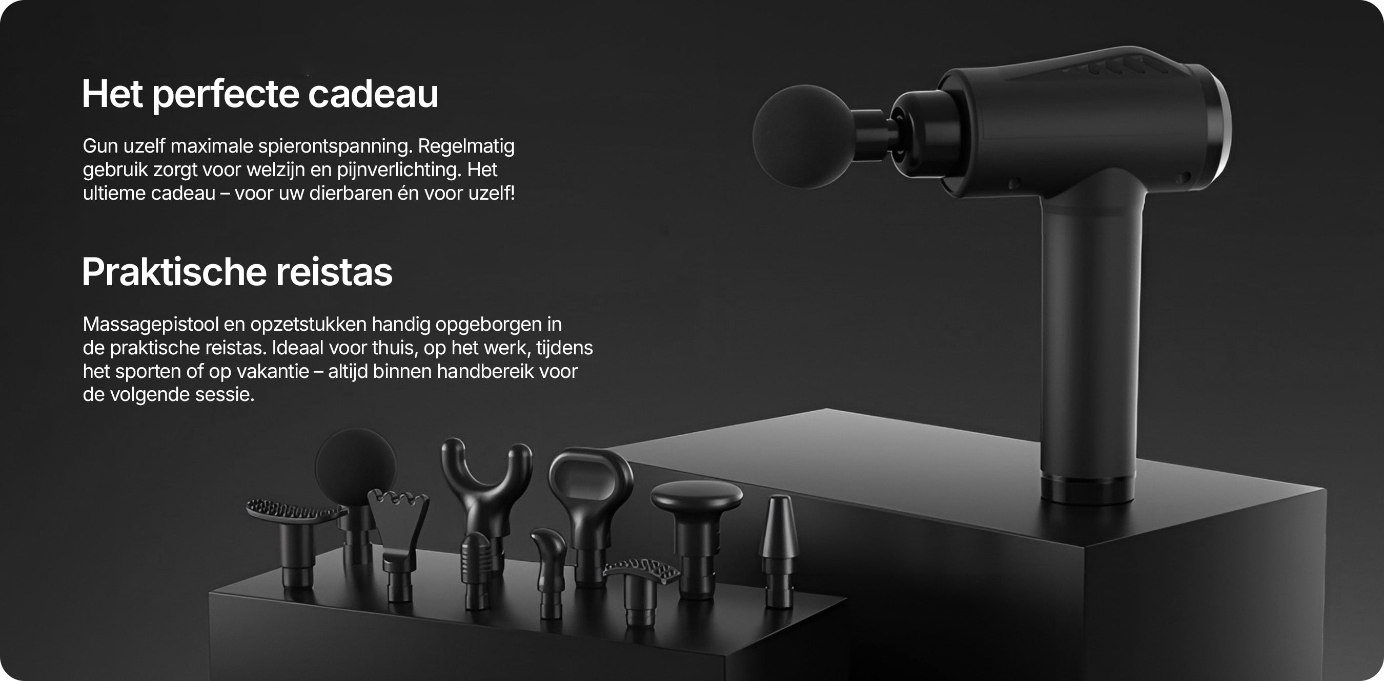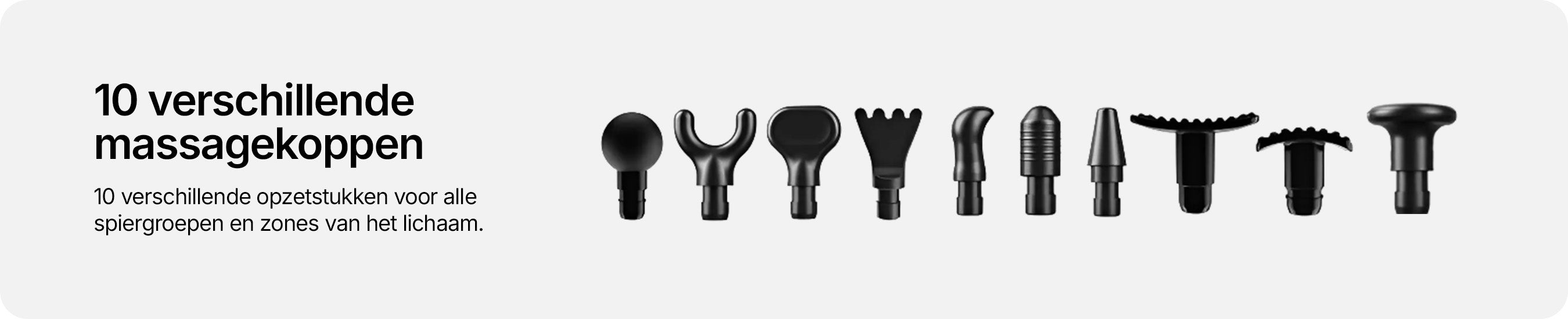 Massagepistool, 10 massagekoppen, handleiding, oplaadkabel, tas
